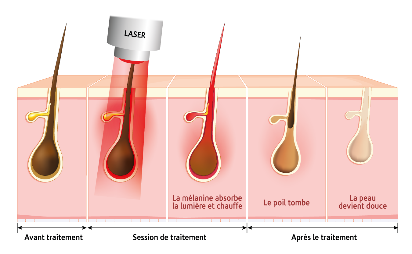 Il agit en ciblant sélectivement la mélanine (dans le poil ou certaines lésions pigmentées) ou l’hémoglobine (dans les vaisseaux en provoquant sa coagulation et sa résorption progressive), tout en préservant la peau environnante.